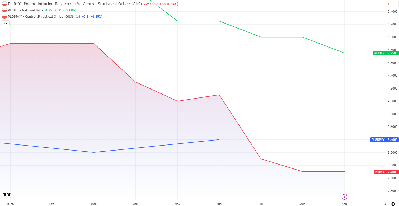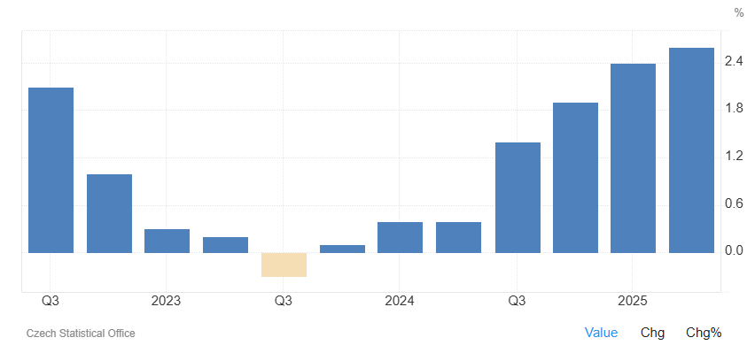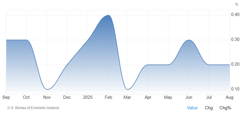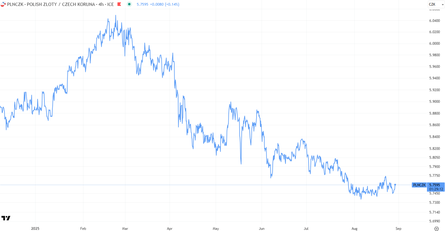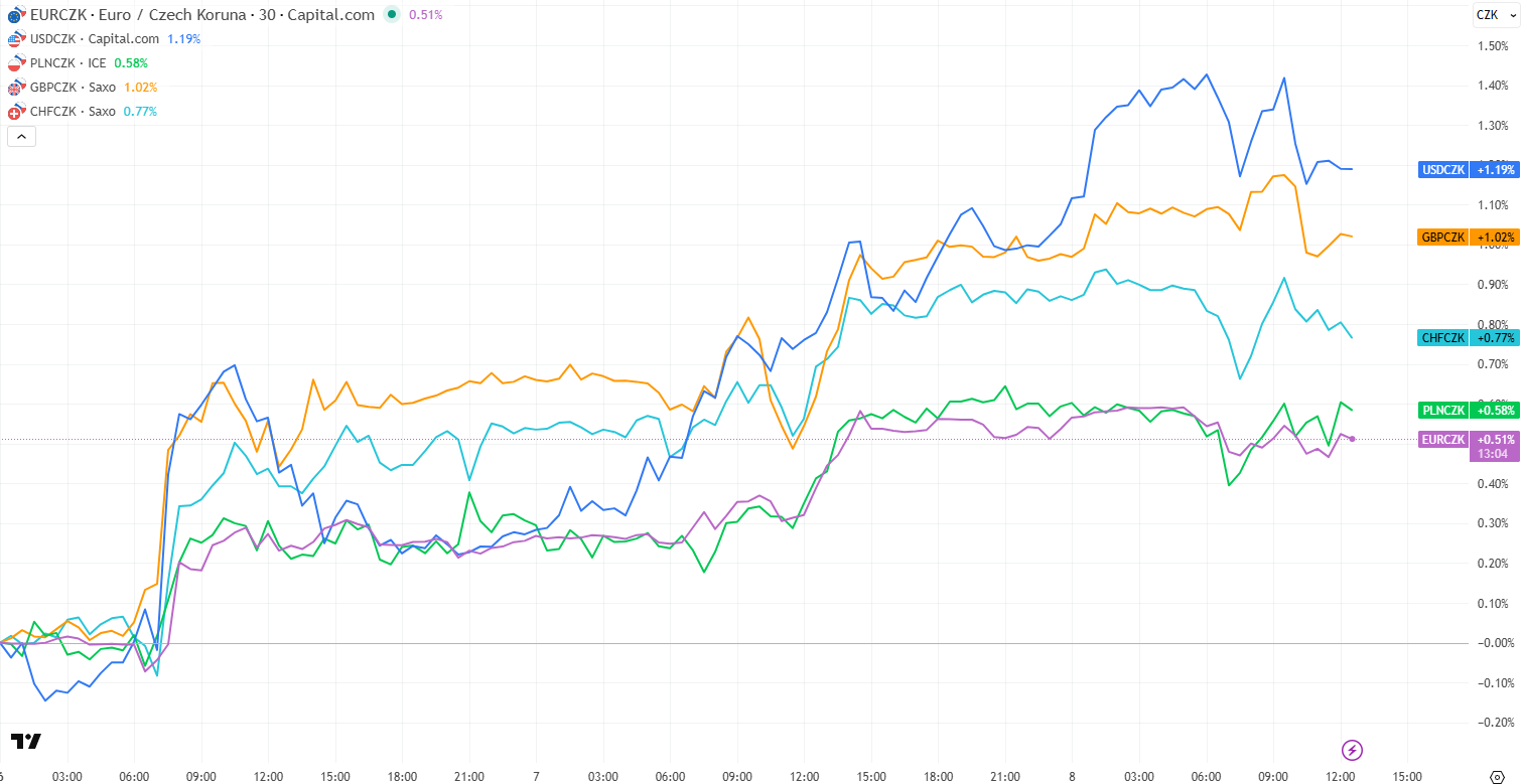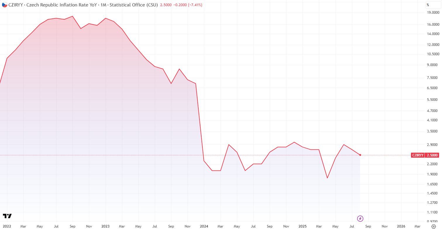 Meziroční inflace v České republice zpomalila v srpnu 2025 na 2,5 % z červencových 2,7 %, čímž potvrdila předběžné odhady. Index cen výrobců dnes v USA meziročně klesl na 2,6 % a zítra proběhne zasedání ECB.