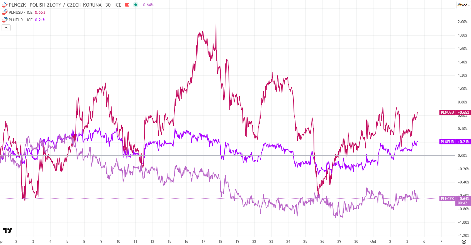 Polská měna posiluje napříč evropskými protějšky. Od začátku října si vůči české koruně a maďarskému forintu připisuje přes 0,5 %, a vůči euru či dánské koruně dokonce více než 0,6 %.