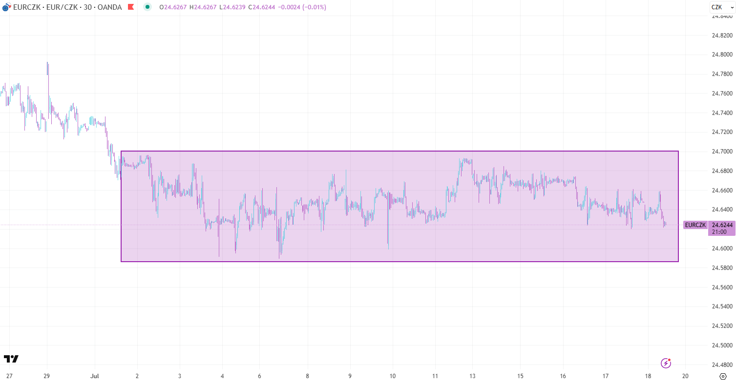 Měnový pár EUR/CZK se v průběhu července obchoduje v úzkém pásmu 24,59–24,69, tedy na nejnižších úrovních od loňského léta. Jakákoli změna v nastavení měnové politiky však může způsobit zvýšenou volatilitu. Případné snížení sazeb ze strany ECB by mohlo způsobit další oslabení eura vůči české koruně.