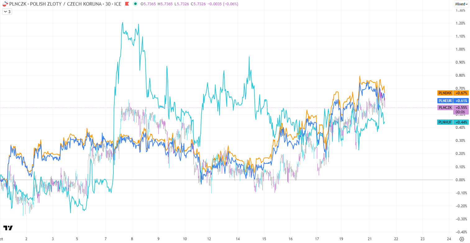 Polská měna posiluje napříč evropskými protějšky. Od začátku října si vůči české koruně a maďarskému forintu připisuje přes 0,5 %, a vůči euru či dánské koruně dokonce více než 0,6 %. Může za to především pozitivní zprávy z polské ekonomiky. V pondělí byla zveřejněna data z průmyslové výroby, která v září ukázala růst o 7,4 %, tedy o 2,4 procentního bodu více, než se původně očekávalo.