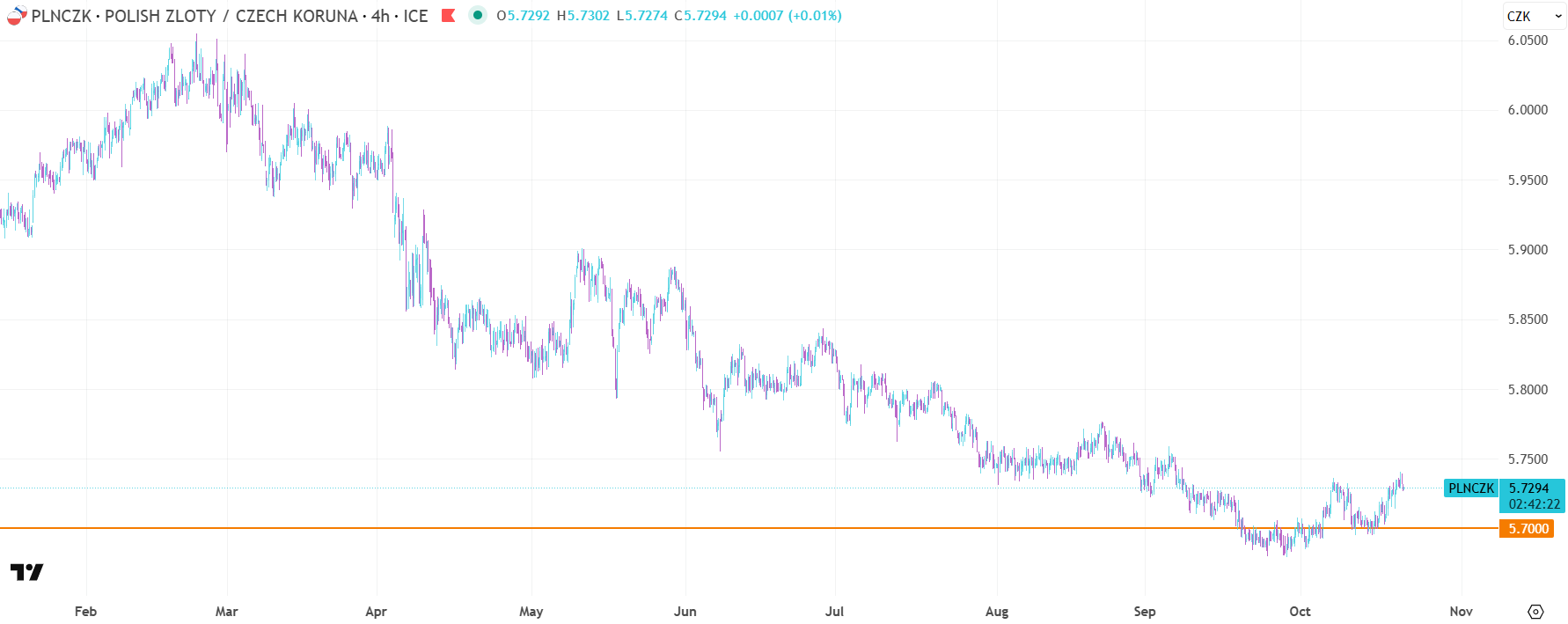 Většinu letošního roku zlotý vůči české koruně oslaboval, což bylo dáno především měnovou politikou ČNB. Zatím se však zdá, že hranice 5,7000 se potvrdila jako silná úroveň podpory. Pokud by se kurz dostal pod tuto hranici, pravděpodobnost dalšího poklesu by mohla vzrůst. Rozhodující ale budou nadcházející makrodata a měnová politika polské i české centrální banky.