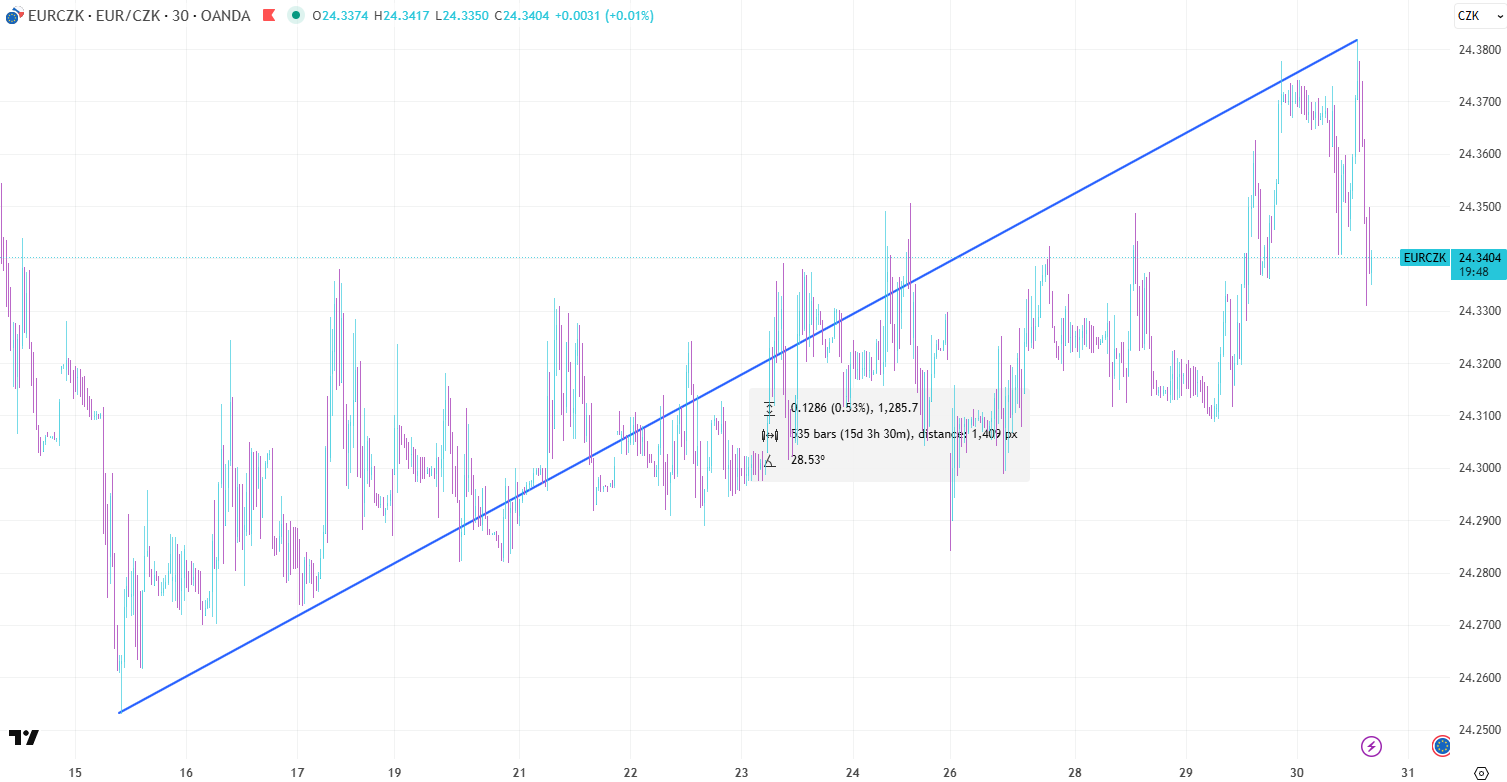 Devizové trhy reagovaly zvýšenou volatilitou. Měnový pár EUR/CZK ve dvou dnech připisoval přes 7 haléřů a překročil hranici 24,38 Kč. Euro pozvolna posiluje už od poloviny října, kdy celkový růst dosáhl zhruba 0,5 % (cca 13 haléřů).