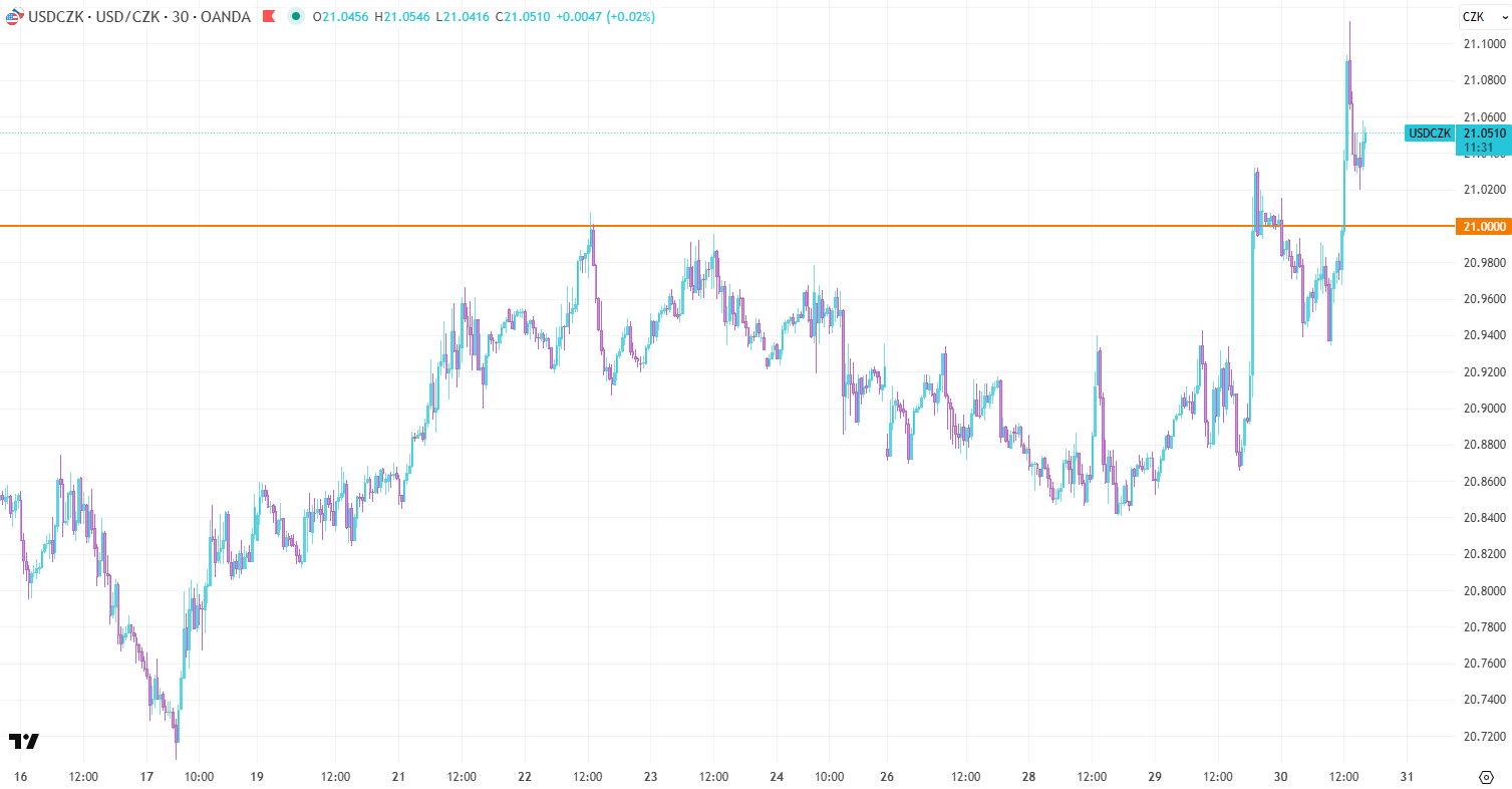 Americký dolar vůči koruně taktéž posílil. Po makro zprávách prorazil důležitou hranici 21,00 Kč za 1 USD a dosáhl maxima 21,1125. Hranice 21 korun fungovala poslední dva týdny jako významná rezistence, avšak změna rétoriky FED-u ohledně prosincového rozhodnutí podpořila dolar o více než 1 %. Za poslední dva týdny tak USD přidává téměř 2 %.