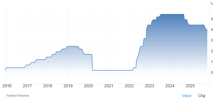 Federální banka v USA včera večer snížila úrokové sazby na 4 %. Jde o pokles o 25 bazických bodů z původních 4,25 %, což bylo plně v souladu s očekáváním trhu. Euforie se však na trzích nekonala, a to z několika důvodů. Prvním je, že toto snížení sazeb bylo již dopředu komunikováno a investoři s ním počítali.